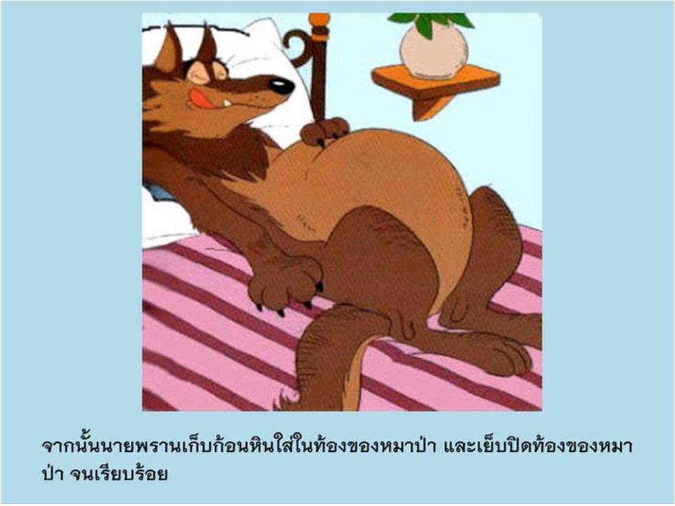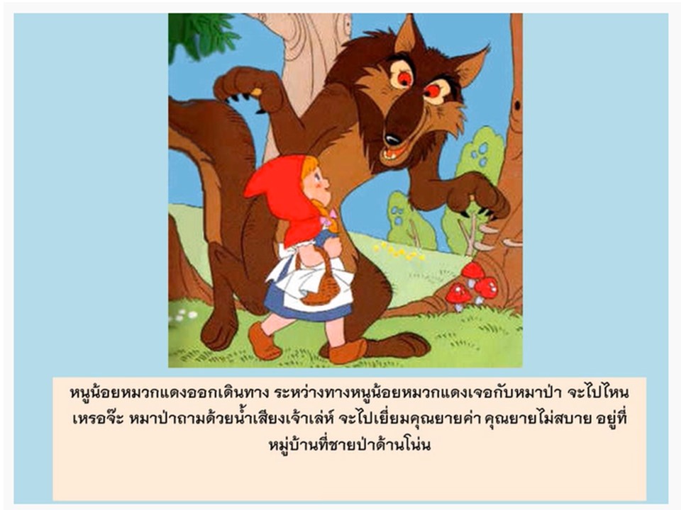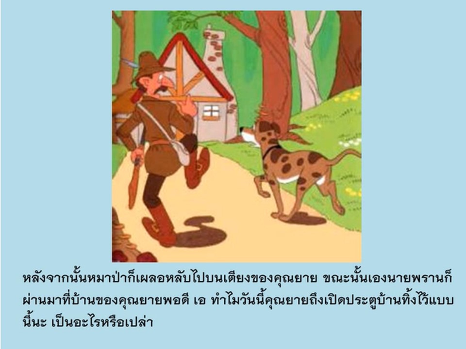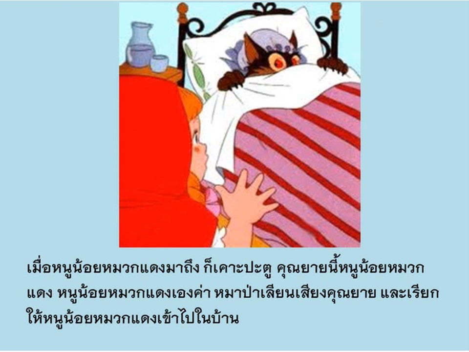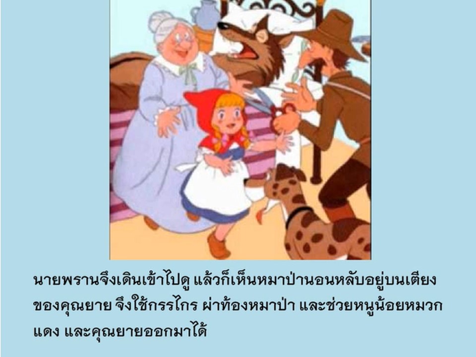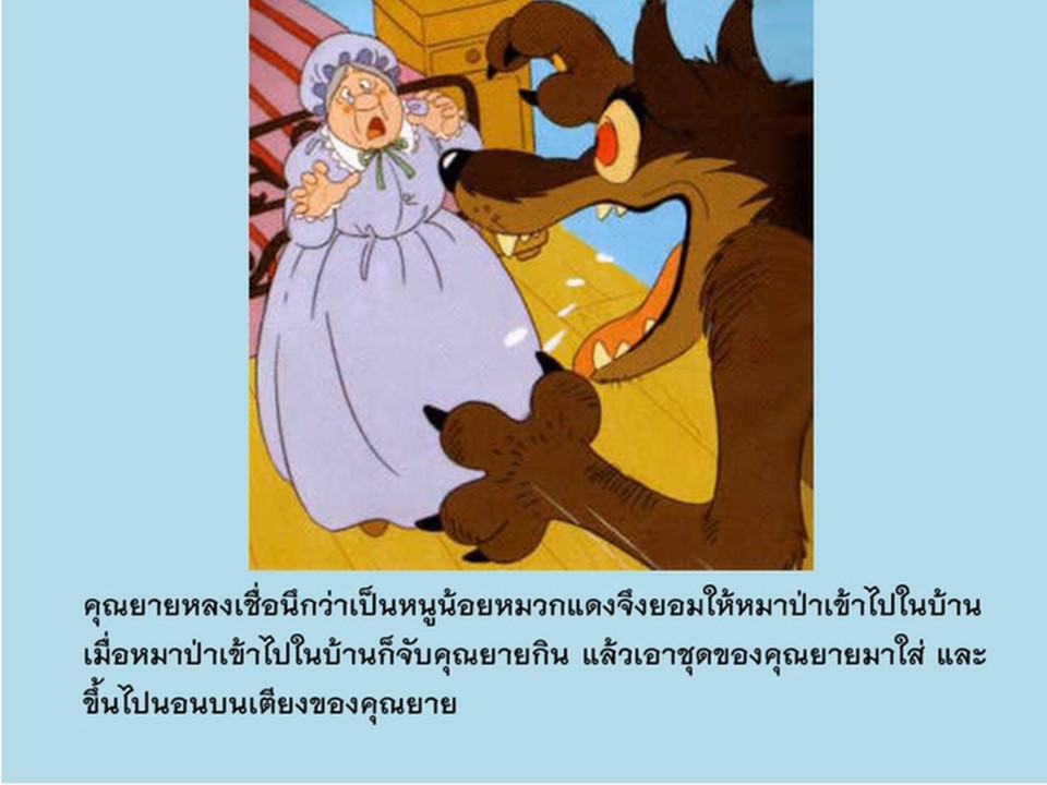 "แล้วทำไมปากคุณยายถึงยื่นยาวอย่งนี้ละคะ ที่ปากยายเป็นแบบนี้ ก็เพราะจะได้กินหลานได้ ถนัด ถนัด ไงละ" !!! ว่าแล้วหมาป่าก็จับหนูน้อยหมวกแดงกิน หลังจากนั้น หมาป่าก็เผลอหลับไปบนเตียงของคุณยาย