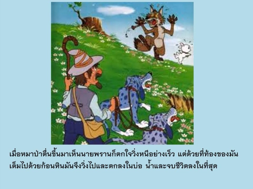 จากนั้นนายพรานเก็บก้อนหินใส้ในท้องของหมาป่าและเย็บปิดท้องของหมาป่า จนเรียบร้อย เมื่อหมาป่าตื่นขึ้นมาเห็นนายพรานก็ตกใจ รีบวิ่งหนีอย่างเร็ว แต่ด้วยที่ท้องของมันเต็มไปด้วยก้อนหิน มันจึงวิ่งไปและตกลงในบ่อน้ำและจบชีวิตลงในที่สุด