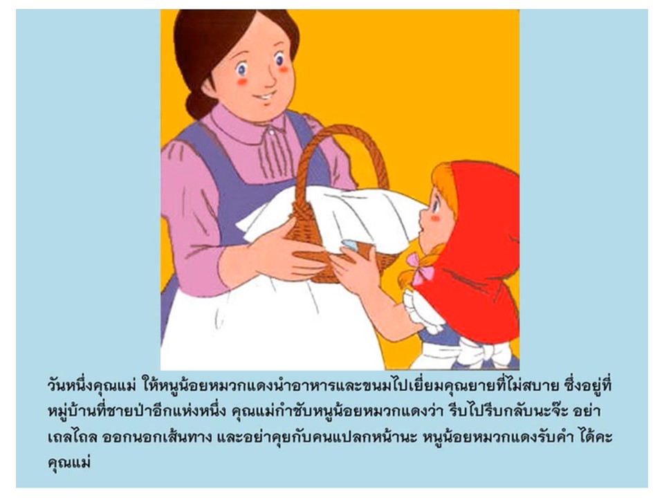 วันหนึ่งคุณแม่ให้หนูน้อยหมวกแดง นำอาหารและขนมไปเยี่ยมคุณยาย ที่ไม่สบาย ซึ่งอยู่ที่ หมู่บ้านที่ชายป่าอีกแห่งหนึ่ง คุณแม่กำชับหนูน้อยหมวกแดงว่า " รีบไปรีบกลับนะจ๊ะ อย่าเถลไถล ออกนอกเส้นทาง และอย่าคุยกับคนแปลกหน้านะ" หนูน้อยหมวกแดง รับคำ " ได้คะคุณแม่ "