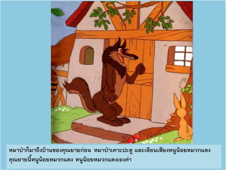 เมื่อเข้ามาในบ้านหนูน้อยหมวกแดงก็กล่าวทักทาย คุณยาย "สวัสดีค่าคุณยาย คุณแม่ให้เอาอาหารและขนมมาให้คุณยายค่า "ขอบใจจ้าหลานรัก ทำไมเสียงคุณยายถึงเป็นแบบนี้ละคะ " ก็เพราะยายไม่สบายเสียงเลยเป็นแบบนี้ " "แล้วทำไมหูของคุณยายถึงยาวแบบนี้ละคะ" "ที่หูยายยาวแบบนี้เพราะจะได้ยินเสียงของหลานชัดๆไงละจ๊ะ"